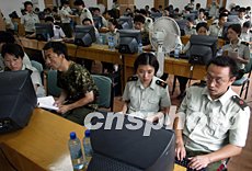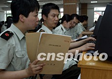 解放軍小湯山醫(yī)院的所有SARS康復患者將在20日出院。18日,院方緊急征調正在隔離區(qū)休整的年輕醫(yī)護人員冒著高溫酷暑向北京SARS數據庫輸入收治的六百多名患者資料。中新社記者:任晨鳴