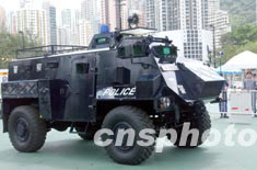 香港警務(wù)處2003年6月22日在香港維多利亞公園舉行的“同心攜手畫(huà)出彩虹”嘉年華活動(dòng)上,展示警用“Saxon撒臣裝匣運(yùn)兵車(chē)”。 中新社記者 錢(qián)興強(qiáng)