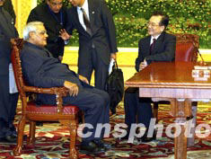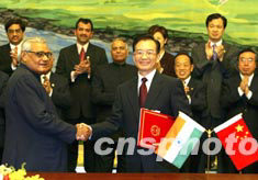 中國國務院總理溫家寶與印度總理瓦杰帕伊二十三日晚在北京簽署《中印關(guān)系原則和全面合作宣言》。中新社記者:滿會喬