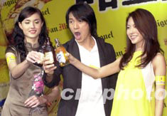 影星周星馳6月23日在香港出席全新生力電視廣告「(口加甘)至系新鮮─放狗篇」首播記者會,他與廣告片中的兩位女角Mandy(左)和Race(右)在會上碰杯。中新社記者 鄧慶樂