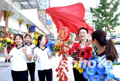 北京二十四日正式解除旅游警告,王府井街頭歡歌一片,市民高舉紅旗、鞭炮、鮮花喜慶北京薩斯疫情獲得階段性勝利。中新社記者:廖文靜