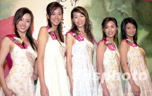 「2003年香港小姐競(jìng)選」6月26日舉行「鉆石肌膚獎(jiǎng)」記者會(huì),二十位候選佳麗再度亮相,圖為1─5號(hào)候選佳麗,郭穎思、曹敏莉、水明璐、吳丹琪、葉逸怡(左起)。 中新社記者 鄧慶樂(lè)
