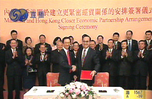 六月十六日,香港特首董建華在正式宣布CEPA月底簽署的消息時這樣說∶“在國家主席胡錦濤、總理溫家寶及副總理吳儀的關(guān)心下,香港與內(nèi)地更緊密經(jīng)貿(mào)關(guān)系安排的磋商,已取得重大的實(shí)質(zhì)性進(jìn)展,雙方已經(jīng)極接近一致意見,并商定於六月三十日在香港舉行簽署儀式!