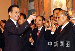 六月二十九日,國務(wù)院總理溫家寶在香港見證“內(nèi)地與香港更緊密經(jīng)貿(mào)關(guān)系安排”簽字儀式,圖為溫家寶在簽字儀式上向香港知名人士祝酒。中新社記者 潘索菲 攝