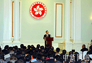 六月二十九日,國務(wù)院總理溫家寶在香港禮賓府發(fā)表講話,并強調(diào)中央政府毫不動搖支持一國兩制。中新社記者 潘索菲 攝