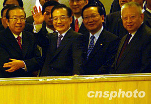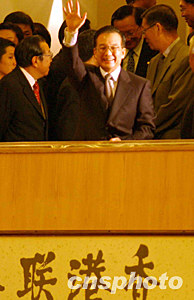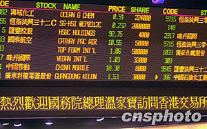 中新社香港六月三十日電 國務(wù)院總理溫家寶今天下午在香港特首董建華及財(cái)政司司長梁錦松陪同下參觀香港交易所。溫家寶到場(chǎng)時(shí),在場(chǎng)交易所工作人員紛紛站立,且以熱烈掌聲歡迎總理一行。