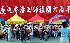 香港慶;貧w六周年在維園舉辦大型慶;顒(dòng),吸引眾多市民頭頂烈日參與嘉年華場(chǎng)內(nèi)游戲活動(dòng)。洪少葵 攝