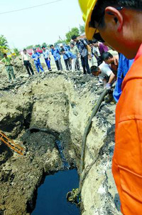 12時(shí)許,經(jīng)過(guò)緊張挖掘,維修人員在地面以下3米的“穿路套管”處,發(fā)現(xiàn)泄漏出來(lái)的原油,記者看到這里油如泉涌。據(jù)現(xiàn)場(chǎng)的技術(shù)人員介紹,從現(xiàn)場(chǎng)情況看來(lái),泄漏情況比較嚴(yán)重,必須把這段長(zhǎng)約24米的“穿路套管”打開(kāi)后才能進(jìn)行維修。