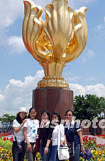 隨著內(nèi)地、香港SARS疫癥的平息,來香港旅游的觀光客明顯增多,圖為游客在金紫荊廣場留影拍照。中新社記者 錢興強(qiáng) 攝