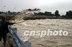 七月四日,安徽淮河水情仍不容樂觀,淮河王家壩分洪閘繼續(xù)全開閘口分洪,當?shù)夭糠秩罕姷介l前捕魚。中新社記者 盛佳鵬 攝