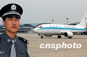 韓國總統(tǒng)盧武鉉七日乘專機(jī)飛抵北京開始其訪華行程,機(jī)場人員加強(qiáng)警戒確保安全。中新社記者:滿會喬