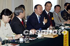2008年北京奧運會組委會副主席蔣效愚7月8日在北京會見以馮滬祥(右一)為團長、郭俊次(右三)為名譽團長的臺灣中華教授協(xié)會大陸參訪團成員,并向他們介紹申奧過程和二零零八年北京奧運會的準備情況。中新社記者:毛建軍