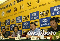 2003年“佳通輪胎杯”中國汽車?yán)悓⒂?月16-17日在長春市重燃戰(zhàn)火,本次比賽路線全長584.65公里,特殊賽段為147.84公里,全部為砂石路面,來自全國的40多輛賽車近百名車手將參加本次比賽。一汽-大眾銷售公司副總經(jīng)理付強(qiáng)(右二)在8日的新聞發(fā)布會上表示,將繼續(xù)支持中國汽車運(yùn)動事業(yè)。中新社記者:趙振清