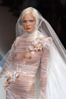 7月9日在巴黎2003/04秋冬時(shí)尚女裝時(shí)裝周上,一位模特現(xiàn)場(chǎng)展示了Jean-Paul Gaultier設(shè)計(jì)的性感透明婚紗。