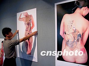 在廣州美術館內,龐國華和朱賢龍十日向媒體展示了他們合作的人體彩繪攝影作品。他們的作品以女性人體之柔美配之相應的肢體語言和攝影元素,給人一種耳目一新的感覺。作者:羅仰明