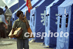 七月十三日,一名受災(zāi)群眾拿著領(lǐng)取的救災(zāi)糧返回搭建在大壩上的帳篷。安徽淮南東風(fēng)湖附近的受災(zāi)群眾安全轉(zhuǎn)移到高地,當(dāng)?shù)卣疄槭転?zāi)群眾送去救災(zāi)糧和各種生活用品。中新社記者:盛佳鵬