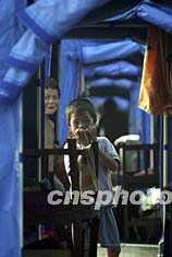 七月十三日,兩名兒童在堤壩上搭建的帳篷中無憂無慮地玩耍。安徽淮南東風(fēng)湖的部分受災(zāi)群眾都被安全地安置到堤壩上,當(dāng)?shù)卣疄樗麄兲峁┝司葹?zāi)糧和各種生活用品,生活逐步正常。中新社記者:盛佳鵬