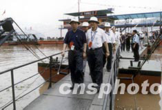 七月上中旬,臺(tái)灣企業(yè)家三峽地區(qū)投資考察團(tuán)一百多人在參觀了重慶一些企業(yè)后來到三峽白帝城游覽。圖為企業(yè)家們乘旅游船在白帝城碼頭上岸。作者:李中全