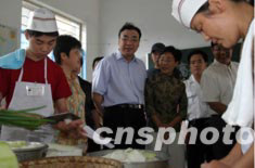 七月十六日,衛(wèi)生部副部長馬曉偉(左三)率領(lǐng)救災(zāi)防疫醫(yī)療小組到安徽淮南受災(zāi)群眾安置點(diǎn)了解當(dāng)?shù)鼐葹?zāi)防疫工作。圖為馬曉偉查看安置點(diǎn)的飯菜衛(wèi)生情況。中新社記者:盛佳鵬