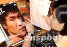 圖為展會上參觀者購買李小龍紀(jì)念雜志。