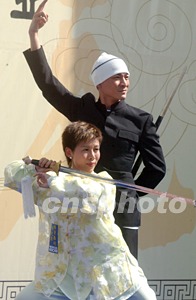香港巨星劉德華、武術(shù)名家李暉,七月十九日在香港舉行的“諾基亞6108揮筆舞劍創(chuàng)記錄”慈善活動(dòng)上,率五百人寫(xiě)書(shū)法及耍太極劍齊創(chuàng)健力士記錄。中新社記者:錢興強(qiáng)