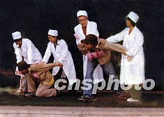 北京首都醫(yī)科大學的大學生們,近日在學校大禮堂舞臺演出活報劇《抗“非典”》。圖為身穿醫(yī)療防護裝的“醫(yī)護人員”將“非典病毒”捉拿歸案,以示正法。作者:首醫(yī)