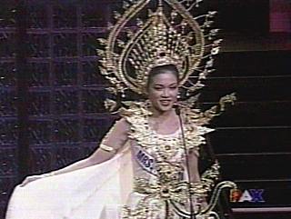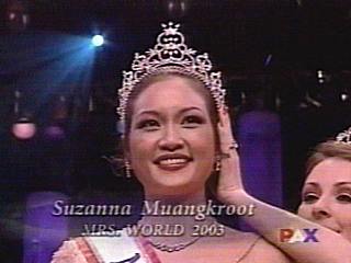來(lái)自全球39位佳麗齊聚美國(guó)拉斯維加斯,為爭(zhēng)取2003年世界太太的桂冠使出混身解數(shù)。來(lái)自泰國(guó)的蘇珊娜在機(jī)智問(wèn)答中,以沉著穩(wěn)重的氣度舒展大將之風(fēng),她被問(wèn)到的題目是為什么希望成為世界太太。她回答:“因?yàn)槲抑来魃狭嘶使诰透队栉沂嬲宫F(xiàn)代女子的能力,無(wú)論在泰國(guó)、美國(guó)、或任何地方,舒展出我們高貴有教養(yǎng),有能力,并舒展我們很愛家人的道德!背藱C(jī)智問(wèn)答贏得評(píng)審注意,蘇珊娜在才藝表演中,以烹調(diào)色香味俱全的泰國(guó)料理吸引評(píng)審。最后她在38名佳麗中脫穎而出,戴上桂冠。