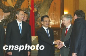 溫家寶說,他高興地看到近年來,中英關(guān)系不斷得到鞏固和發(fā)展,他愿以布萊爾此次訪問為起點,與其攜手共同拓展雙邊關(guān)系,使中英關(guān)系取得更快、更大的發(fā)展。