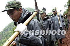 解放軍官兵二十三日冒雨前往受災嚴重的云南省大姚縣曇華鄉(xiāng)山區(qū),參加抗震救災。中新社記者:毛建軍