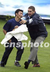 一名在昆明觀看西班牙皇家馬德里足球隊(duì)二十六日下午在的訓(xùn)練的狂熱球迷跳入場(chǎng)中,口中呼喊著勞爾的名字,希望得到簽名,被及時(shí)趕來的工作人員阻止。中新社記者:毛建軍