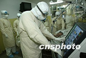 北京一名病程達89天、年近六旬的男性SARS患者,7月26日中午經(jīng)北京市首席SARS醫(yī)療專家王辰(前)等搶救無效死亡。目前,北京尚有12名住院SARS患者,經(jīng)專家組近日會診,絕大多數(shù)患者的SARS病癥已經(jīng)痊愈,沒有傳染性,困擾他們的是其他基礎(chǔ)病。中新社記者:任晨鳴