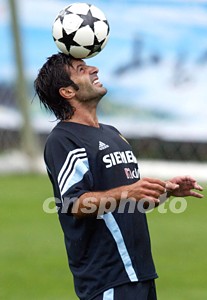 皇馬巨星菲戈雨中練習(xí)頭球功夫。中新社記者:毛建軍