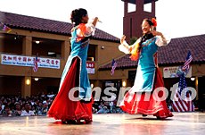北加州華人運(yùn)動會好時(shí)威之夜頒獎晚會七月二十六日晚在美國圣荷西市舉行,生活在美西灣區(qū)的華裔演藝人士為頒獎晚會獻(xiàn)上了精彩的演出。圖為中華演藝學(xué)院的學(xué)員表演蒙族舞《情思》。作者:陳鋼