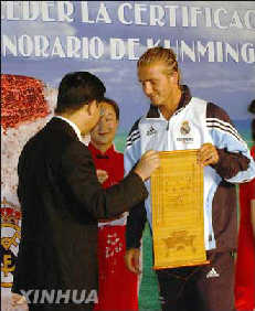 昆明市市長章振國向包括勞爾、齊達內(nèi)、羅納爾多、費戈、卡洛斯、貝克漢姆等六大巨星在內(nèi)來昆明集訓的25名球員,以及俱樂部主席佩雷斯、體育部經(jīng)理巴爾達諾、主教練奎羅茲等5名官員頒發(fā)了榮譽市民證書和金鑰匙,同時還向皇馬其他19名成員等贈送了金鑰匙。