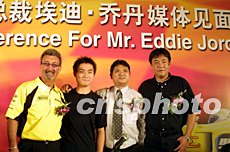 二十九日,喬丹車隊(duì)總裁埃迪·喬丹在上海出席媒體見面會(huì),表示喬丹車隊(duì)有信心獲得F1上海站的冠軍。圖為埃迪·喬丹在見面會(huì)上與中國車手江騰一(左二)等合影留念。作者:湯彥俊