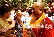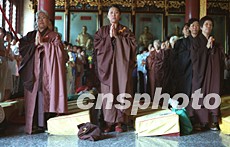 慶典儀式于上午十時(shí)在潭柘寺大雄寶殿外小廣場(chǎng)舉行。大雄寶殿上方“潭柘寺建寺一千六百九十六年暨祈禱世界和平國(guó)泰民安法會(huì)”紅色橫幅十分醒目。北京佛教協(xié)會(huì)、北京市文物局、北京市旅游局負(fù)責(zé)人以及數(shù)百名中外游客參加了慶典儀式。隨后,潭柘寺方丈常道法師在大雄寶殿內(nèi)主持法會(huì)。二十多位住寺僧侶及眾多善男信女在缽和木魚等敲打樂(lè)的伴奏下吟唱佛經(jīng)。常道法師向佛像敬香、頂禮膜拜,祈禱世界和平國(guó)泰民安。