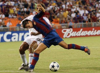 中新網(wǎng)7月31日電 在北京時(shí)間今天上午進(jìn)行的一場(chǎng)國(guó)際友誼賽中,來自西班牙的巴塞羅那隊(duì)?wèi){借著新加盟的球員夸雷斯馬和羅納爾迪尼奧的進(jìn)球,以2-0擊敗了歐洲冠軍AC米蘭隊(duì)。