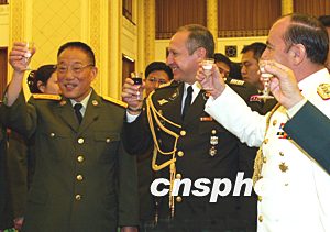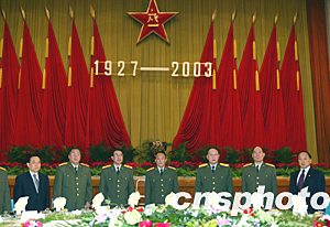 中新社北京七月三十一日電 中國國防部三十一日在北京舉行盛大招待會(huì)慶祝建軍七十六周年。中央軍委副主席、國務(wù)委員兼國防部長(zhǎng)曹剛川上將致祝酒詞。中央軍委委員、總政治部主任徐才厚上將,中央軍委委員、總參謀長(zhǎng)梁光烈上將,中央軍委委員、總后勤部部長(zhǎng)廖錫龍上將,中央軍委委員、總裝備部部長(zhǎng)李繼耐上將出席了招待會(huì)。
