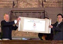 載著奧運(yùn)會會徽的車輛從中華世紀(jì)壇出發(fā),經(jīng)過長安街,經(jīng)過半小時(shí)的運(yùn)送經(jīng)達(dá)天壇,由鄧亞萍和成龍護(hù)送進(jìn)入現(xiàn)場。