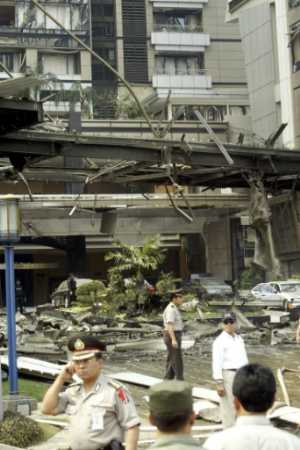 8月5日,印尼首都雅加達(dá)南部的中心商業(yè)區(qū)萬豪酒店發(fā)生劇烈爆炸。周圍幾幢建筑也受到爆炸沖擊。據(jù)印尼警方稱,到目前為止至少有8人在爆炸中死亡,另有103人重傷。(春風(fēng))