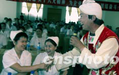 八月五日,由中國文聯(lián)組聯(lián)部、團(tuán)中央辦公廳、中國民間文藝家協(xié)會等多家單位聯(lián)合主辦的健之素“全民抗非典”故事會為中鐵建總醫(yī)院的醫(yī)生們送上了一場演出,此次故事會將在北京進(jìn)行約二十場義演。圖為有“陜北民歌大王”之稱的賀玉堂為醫(yī)生、護(hù)士們演唱陜北民歌。作者:盛佳鵬