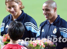 八月六日晚,香港舉行歡迎西班牙皇家馬德里足球隊(duì)抵港記者會,圖為小朋友向“皇馬 ”球星獻(xiàn)花。中新社記者:錢興強(qiáng)