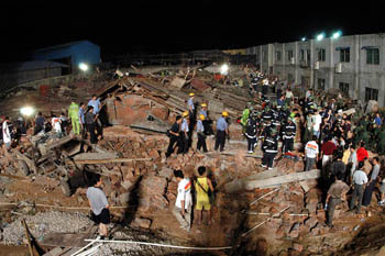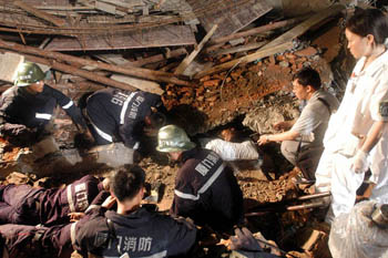 圖:廈門(mén)消防人員搶救壓在廢墟中的民工