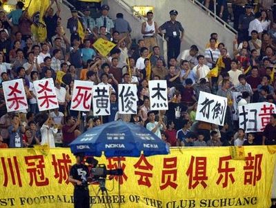 昨日京川之戰(zhàn)的上座率并不高,但球迷的怒氣卻能創(chuàng)下成體之最。比賽第4分鐘,鄒侑根被對方防守隊(duì)員拉倒,裁判未判點(diǎn)球,“黑哨”的聲音頓時(shí)響起。第43分鐘,現(xiàn)代隊(duì)安德烈將比分改寫為1∶0,部分球迷認(rèn)為這個(gè)進(jìn)球有越位嫌疑。上半場結(jié)束后,黃俊杰到冠城會(huì)員區(qū)附近撿球,馬上引起看臺(tái)上一片騷動(dòng),小旗桿、廢紙團(tuán)冰雹般往黃俊杰身上扔。在回休息室的路上,黃俊杰再次遭到“襲擊”,裝滿水的礦泉水瓶“砰”的砸在球員通道上,記者還能看到里面的人影應(yīng)聲躲閃。下半場開始后,新的標(biāo)語牌在球迷區(qū)舉起,“殺殺殺死黃俊杰”,顯得觸目驚心,部分球迷甚至喊起了帶有人身攻擊的不文明口號(hào)。汪嵩的進(jìn)球被判為越位后,助理裁判朱宏慶也成了被攻擊對象,2區(qū)的球迷齊齊豎起中指,一邊高喊:“邊裁,小心得‘非典’!”