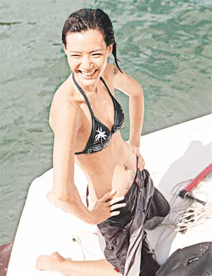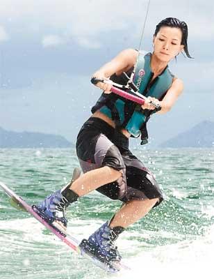香港媒體報道,滑水比賽在大潭篤舉行,Candy不但滑水技術(shù)了得,身上的性感三點式泳裝也搶鏡過人,Candy在比賽開始時,身穿大會的T恤,其后Candy玩得興起,放開胸懷以三點式泳衣亮相,任由記者拍照,還擺出各種姿勢。