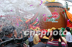 八月十五日,中國(guó)著名啤酒企業(yè)“青島啤酒”迎來百年華誕。青島啤酒新百年第一桶啤酒十五日上午正式開啟。中新社記者:張煒
