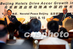 法國(guó)雅高亞太區(qū)董事行政總經(jīng)理艾森柏(右)十五日在北京宣布,包括中國(guó)首家國(guó)際經(jīng)濟(jì)性酒店天津宜必思在內(nèi)的九家酒店即將在中國(guó)開(kāi)業(yè)。他表示“非典”并沒(méi)有降低中國(guó)未來(lái)發(fā)展?jié)摿,這是拓展中國(guó)酒店網(wǎng)絡(luò)最有利的時(shí)刻。中新社記者:鄭萍萍