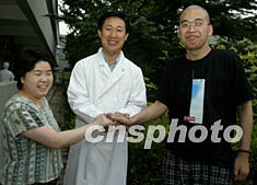 北京SARS醫(yī)療專家、人民醫(yī)院ICU主任安友仲教授,8月15日到北京地壇醫(yī)院祝賀將于16日出院的中國(guó)最后兩名SARS康復(fù)患者孫崢(右)、盧志艷(中)。安友仲教授曾在過(guò)去的三個(gè)月內(nèi)分別參予這兩名患者的轉(zhuǎn)院搶救治療。中新社記者:任晨鳴