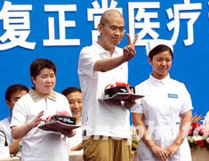 中國最后兩名非典病人孫錚(中)和盧志艷(左一),八月十六日上午于北京地壇醫(yī)院康復(fù)出院,并向醫(yī)護(hù)工作者告別。中新社記者:鄒憲