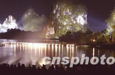 中新社陽朔八月十七日電(記者王永志)素有“山水甲天下”的桂林陽朔昨晚開排山水實(shí)景演出《印象.劉三姐》。主辦者稱,以方圓二公里的漓江水域做舞臺(tái),以十二座山峰和廣袤天穹做背景,并有數(shù)百名漁民和專業(yè)演員參加演出,將是世界上最大的山水實(shí)景演出。